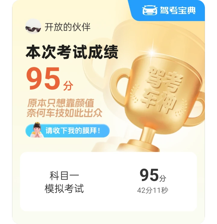 彻夜下苦功夫,一个月了最高就一次100分。总共模拟了25次,95至100分有20次、95以下1次。驾校测了10多次,全部成绩95至99分之间,可我还在勤练苦读、刚测试完。清晨8点就天亮了、此刻为凌晨03:18' ,而我还在思索着。 “到底礼拜天预约呢 ,还是再靠后一天?” …