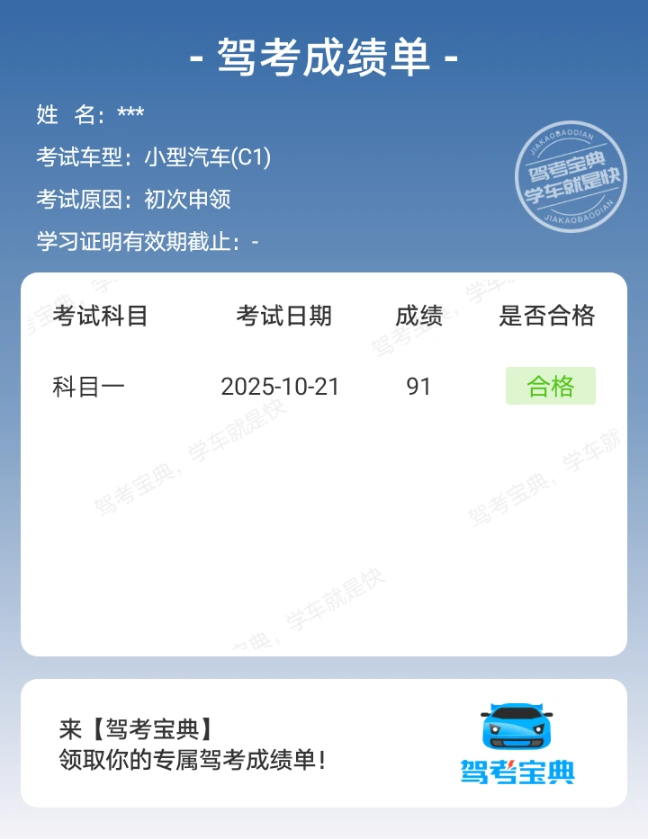 当前位置:首页>驾考圈>科目一>科一顺利通关,友友们收下这份驾