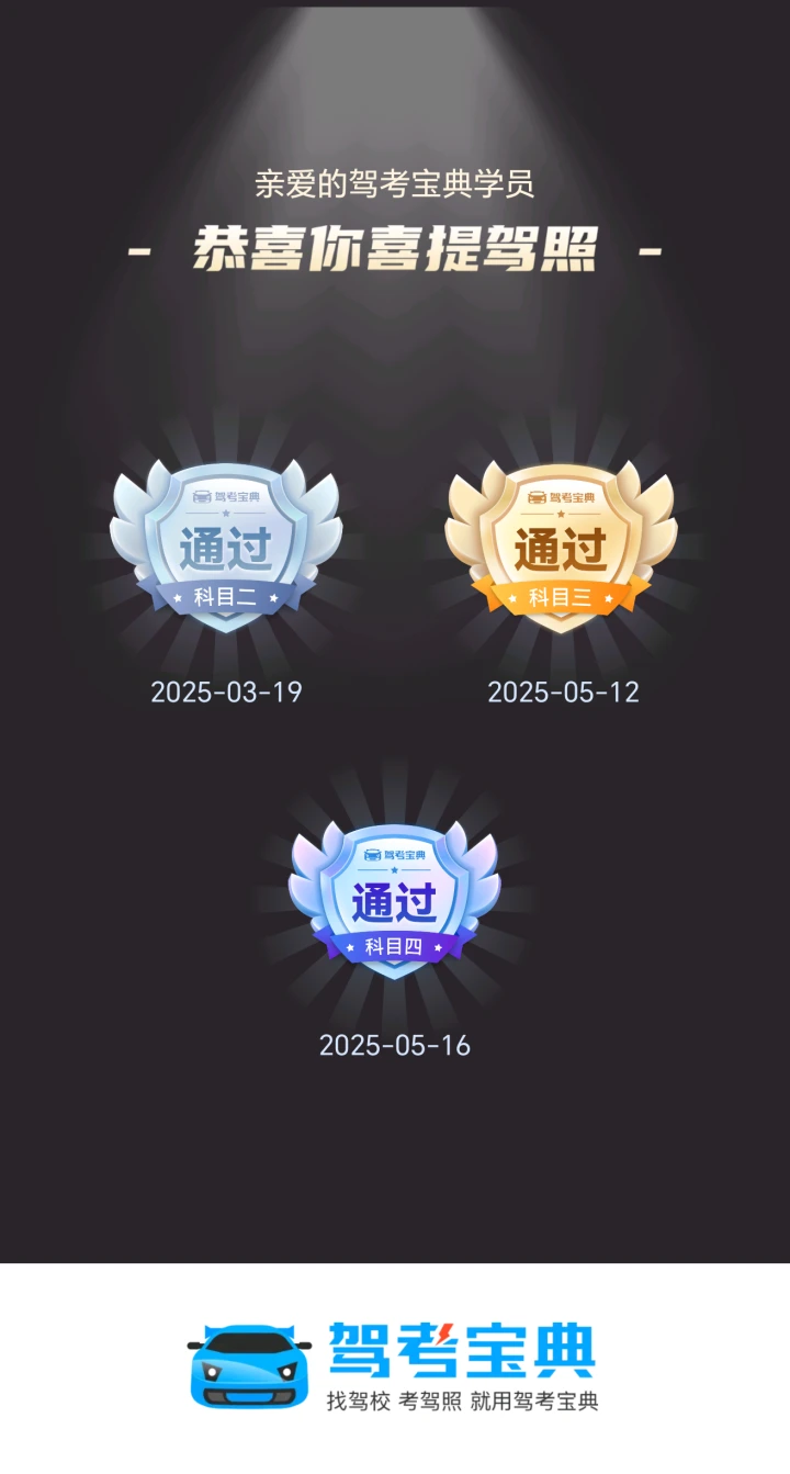 浅浅记录一下驾考成绩。科一到科四