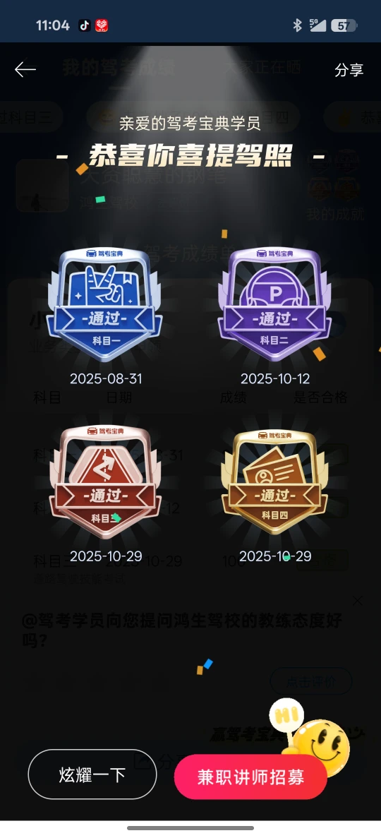 8.31-10.29,边上学边练车,终于结束我的练车生活了,上午科三科四直接秒了,可惜没截图成绩